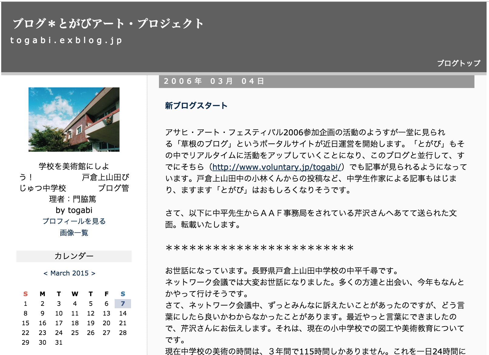 Nプロジェクトに関する資料のなかで、おそらく、もっともその中身を生々しく、色濃く伝えているのはきっと「ブログ」だと思います。中平千尋・紀子先生はもちろんのこと、「とがび」や「さくらび」に参加した中学生や卒業生、関わったアーティストなど、それぞれの思いや考察、叫びが綴られてきました。